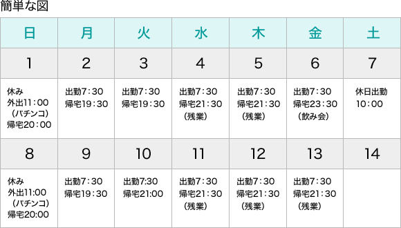 | ・休み ・外出11:00 (パチンコ) ・帰宅20:00 |
